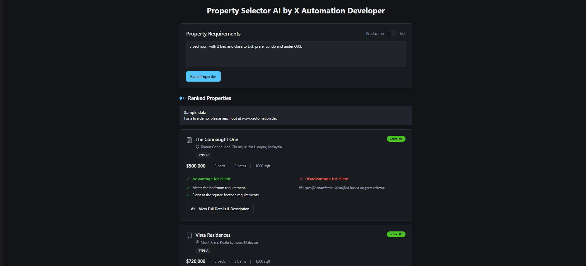 AI Recommendation: A side-by-side showing how the property matches the client's requirement or when it is not.